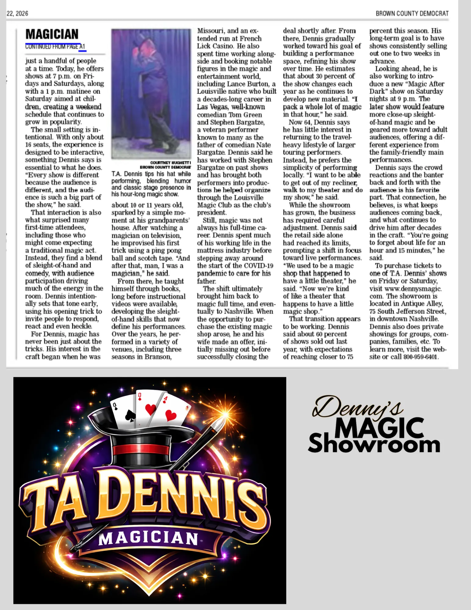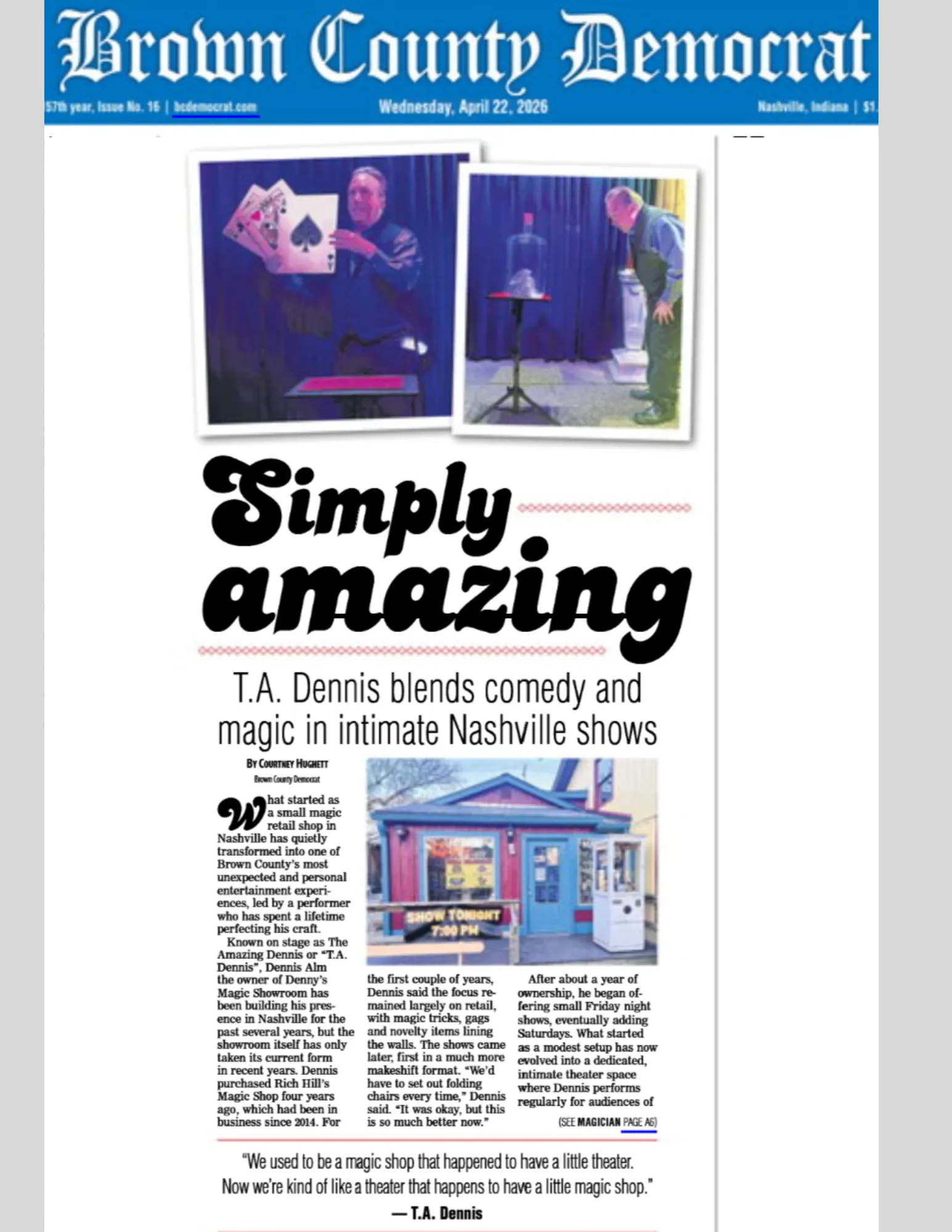 Visiting Nashville, Indiana? The T.A. Dennis Show is one of the top-rated things to do in Brown County. Perfect after dinner show! Great for date night! Fun for the whole family! Indoor show — great in any weather!